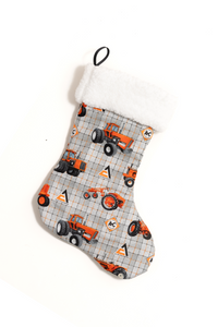 Allis Chalmers Tractor and Logo Christmas Stocking, Gray Plaid Background